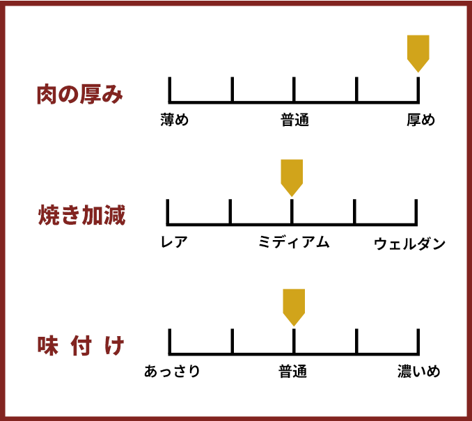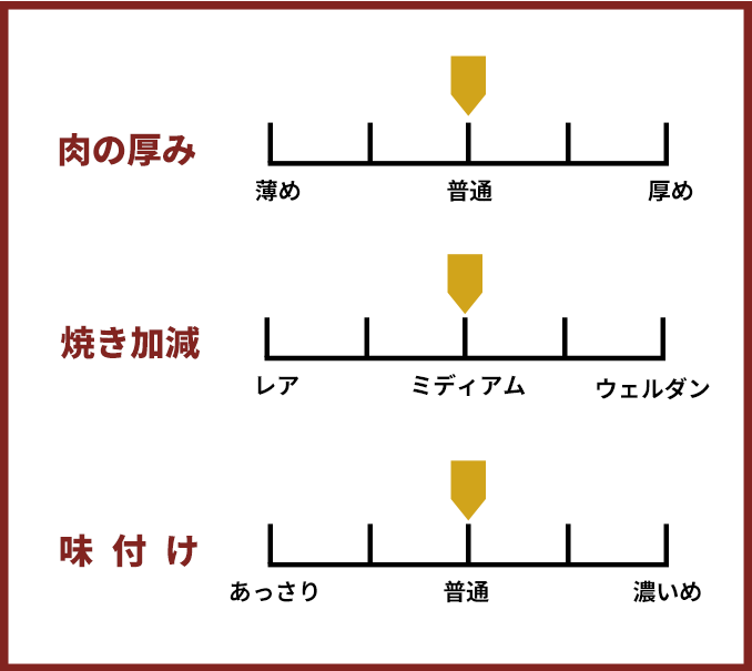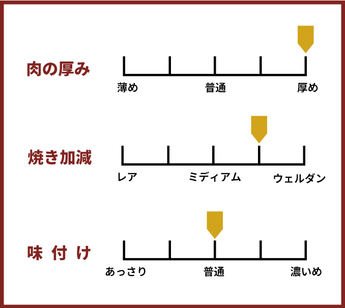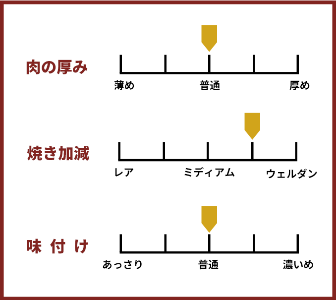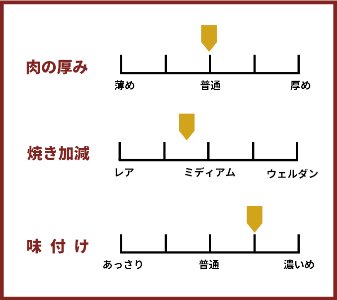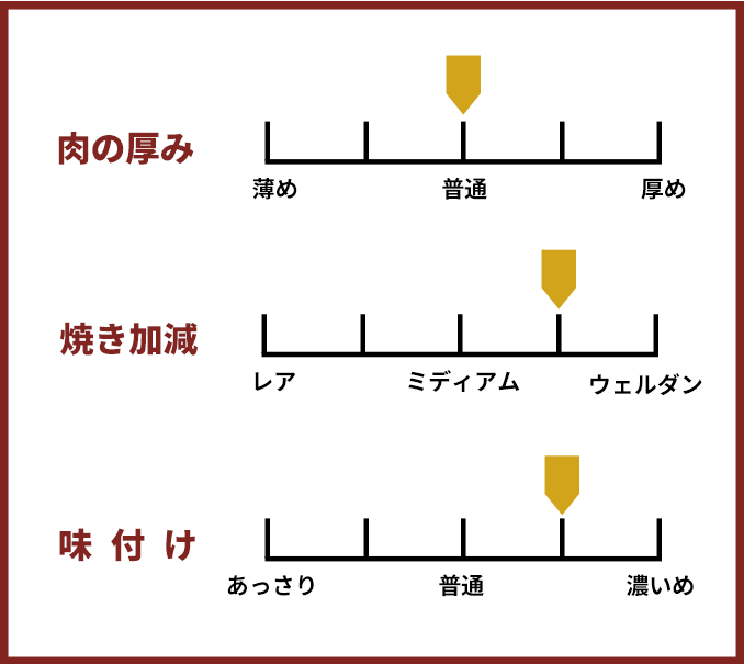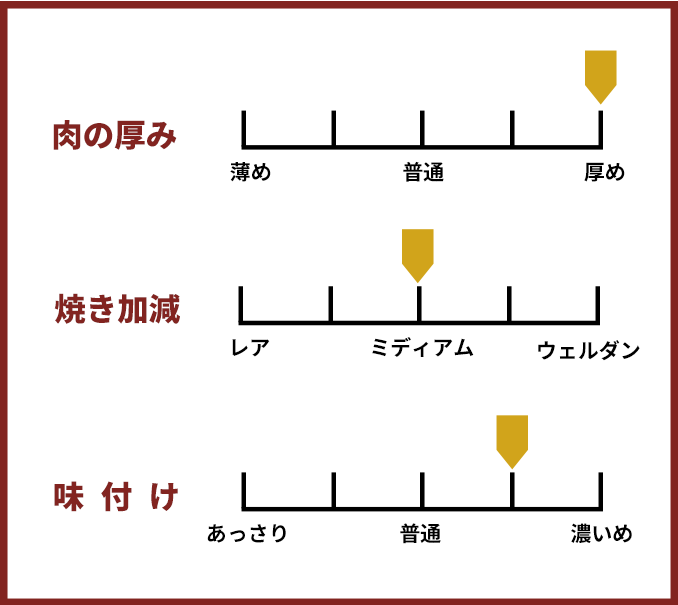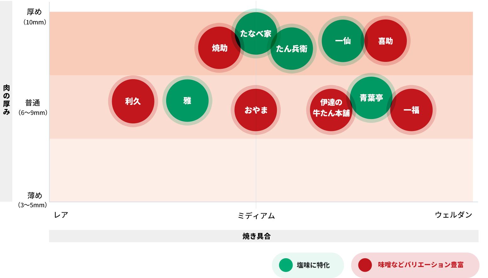 それぞれの特徴を、味付け・焼き加減・肉の厚みの3つの軸でポジショニングしてみました。