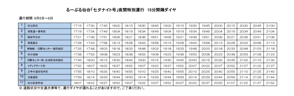 ※七夕ナイト号は、通常の「るーぷる仙台」の経路にある「青葉山駅」、「理学部自然標館前」、「交通公園・三居沢水力発電所前」、「大崎八幡宮前」には停まりません。