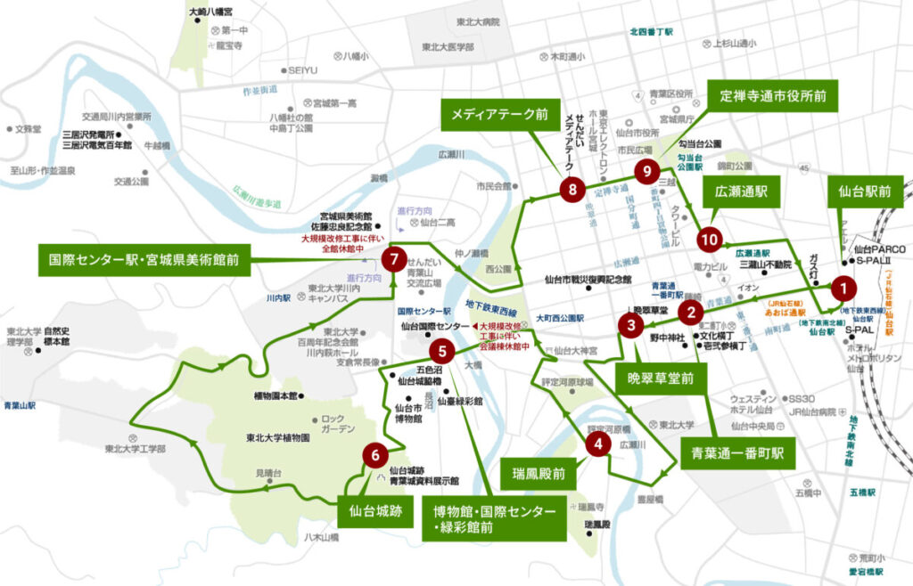 ①仙台駅前~(既存路線)~⑤博物館・国際センター・緑彩館前~⑥仙台城跡~⑦国際センター駅・宮城県美術館前~⑧メディアテーク前~⑨定禅寺通市役所前~⑩広瀬通駅~①仙台駅前