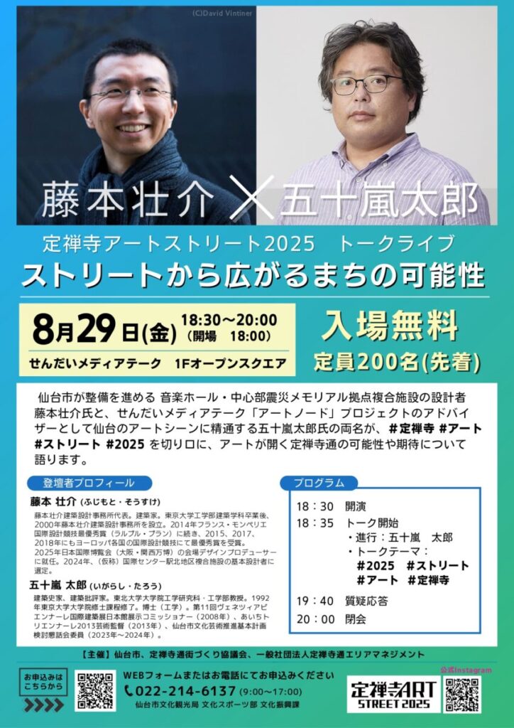 仙台市が整備を進める音楽ホール・中心部震災メモリアル拠点複合施設の基本設計者 藤本壮介氏と、せんだいメディアテーク「アートノード」プロジェクトのアドバイザーとして仙台のアートシーンに精通する五十嵐太郎氏の両名が、#定禅寺 #アート #ストリート #2025を切り口に、アートが開く定禅寺通の可能性や期待について語ります。