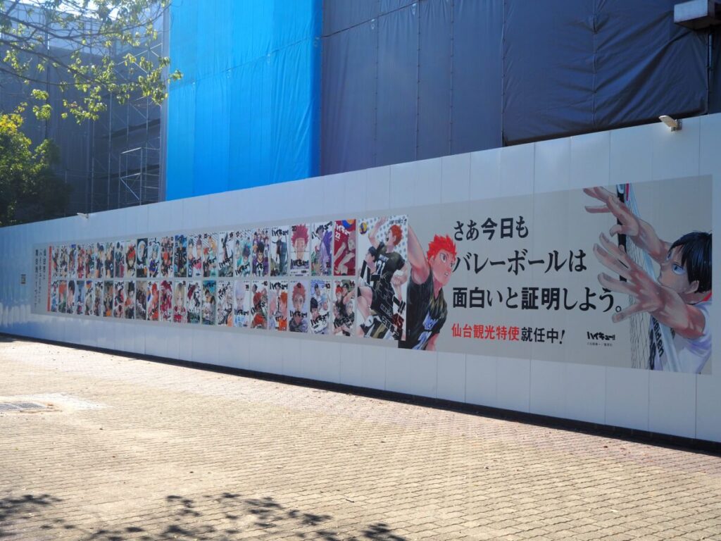 カメイアリーナ仙台(仙台市体育館)の仮囲いに漫画『ハイキュー!!』のイラストが掲出されています